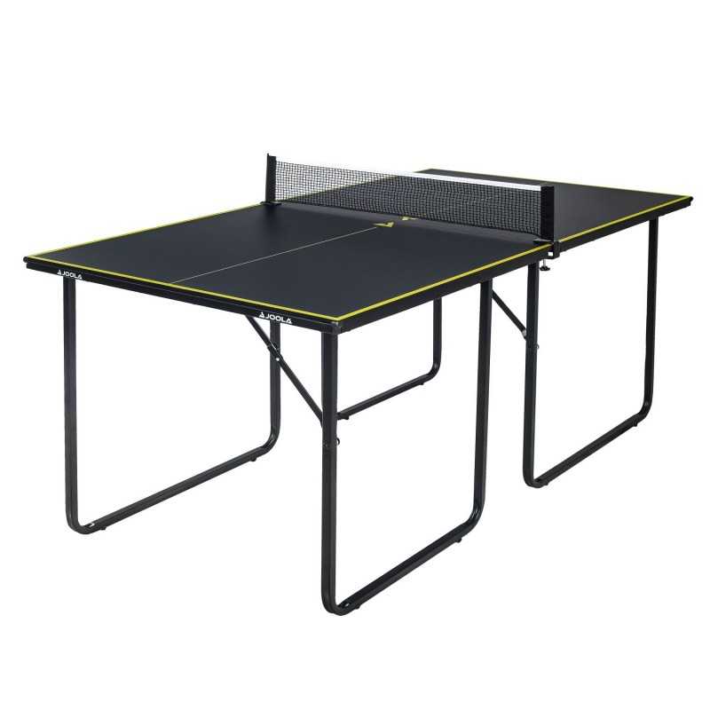 La mesa de ocio JOOLA MIDSIZE con un diseño elegante. La superficie de juego gris oscuro en combinación con detalles en color lima hacen que la mesa llame la atención. Por sus reducidas dimensiones, es ideal para espacios reducidos y estancias pequeñas. Las mitades de la mesa premontadas se pueden configurar en segundos y garantizan la máxima diversión. El conjunto de red ya está incluido, por lo que puede comenzar a jugar de inmediato. La mesa para toda la familia es versátil y también se puede utilizar como mesa portátil para juegos de cartas o de mesa, por ejemplo. Una vez montada, la mesa tiene las dimensiones 168 cm (largo), 84 cm (ancho) y 76 cm (alto). El peso total es de 22 kg.
