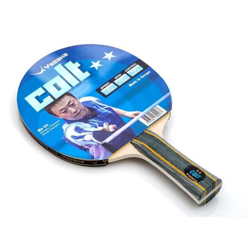 COLT es una raqueta montada moderna con un diseño exclusivo. El mango tiene láminas de madera tintadas con inserción de lente de colores. La forma del mango es cóncava (FL) para mayor comodidad. Las gomas de 2* facilitan el golpeo de la pelota con efecto sin perder el control.