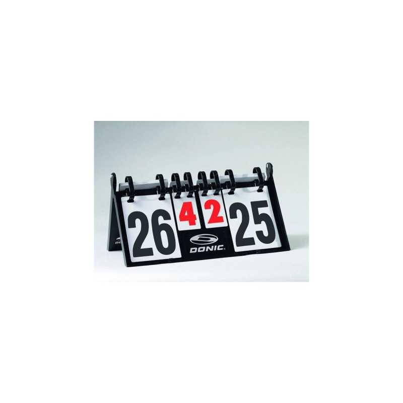 De plástico duro permitiendo un fácil giro de los números. Puede plegarse fácilmente. Con indicador de tiempo muerto. Numeración sets (0-5) y de puntos (0-30). Medidas: 38x3,5x21cm (plegado).