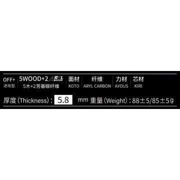 Las chapas Koto son de dureza media, lo que ofrece una sensación directa en el impacto, a la vez que te da mucha confianza en tu juego ofensivo. La fibra de carbono Arylate estabiliza la madera y le proporciona un amplio punto dulce, además de una sensación especial en la mano, ya que se minimizan las vibraciones y se siente mejor la bola.